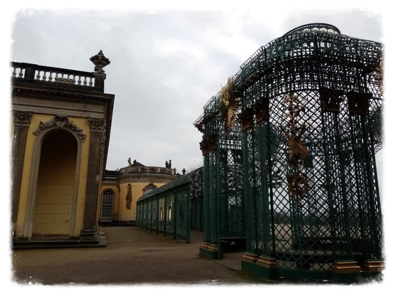 Korinthische Pilaster schmücken die Front. Das Pendant zum halbovalen Mittelbau auf der Gartenseite bildet ein rechteckiger Risalit mit Blendsäulen und flachem Pultdach. Weiterfüfrende Kolonaden umschließen im Halbrund den schmucklosen Ehrenhof und öffnen sich zu der nördlich gelegenen steilen Zufahrtsrampe. Vor dem Betrachter erhebt sich die von Knobelsdorff entworfene Kolonnade um den Ehrenhof des Schlosses Sanssouci, in das sich der König zurückzog, um von hier aus zu regieren. Schon das ist ein Widerspruch, denn eigentlich ist Sanssouci ein Maison de plaisance, also ein Lusthaus, in das man sich für das Vergnügen zurückzog, abseits von Hofzeremoniell und Staatspflichten. Friedrich II. aber verwaltete von hier aus mithilfe seiner Sekretäre das Land. Der Ehrenhof ist der Ort des offiziellen Empfangs, gehört also auf die Hauptseite einer Residenz. Doch von jeher scheint die Gartenfront die Vorder- und der Ehrenhof die Rückseite zu sein.